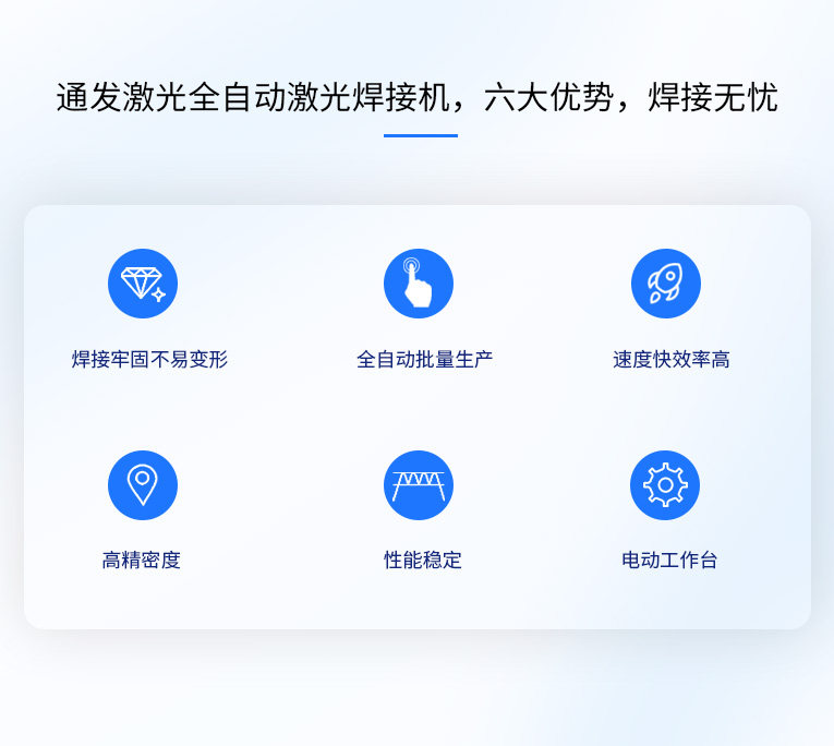 通發激光TFL-300V全自動激光焊接機,廣泛適用各種不銹鋼五金的激光焊接。可實現大多數0.8mm以內料厚五金產品的二維平面焊接。效率高,性能穩定,性價比高。配置精密運動控制器和工作臺高速運動實現焊接。