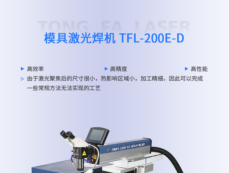 出口型模具激光焊機(jī)是通發(fā)激光公司專門為出口國外客戶使用而設(shè)計(jì)的系列機(jī)型TFL-200E-D,配置激光頭電動(dòng)升降,同時(shí)配置操縱桿無極調(diào)速控制XY橫向和縱向電動(dòng)移動(dòng)。適用于各類精密注塑模具、壓鑄模具等模具激光修補(bǔ)焊接;同時(shí)也適合鑄件沙孔激光修補(bǔ)、模具崩缺激光修復(fù)、過切加工等的激光修補(bǔ);各類金屬結(jié)構(gòu)件、金銀首飾的激光焊接加工。