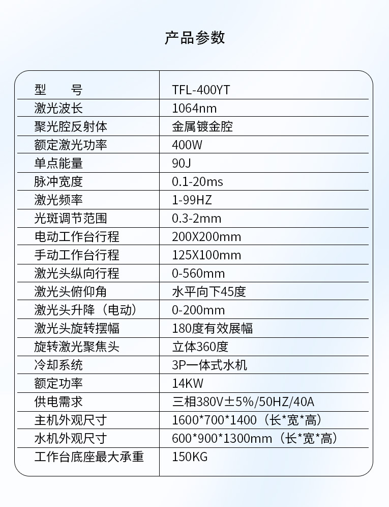 通發(fā)激光一體式模具激光焊機(jī)TFL-400YT是一款多種功能融合一體的新型模具激光焊接機(jī),針對(duì)特大型塑料模具激光焊、中型注塑模具激光燒焊、小型塑膠模具激光補(bǔ)焊、壓鑄模激光補(bǔ)焊具等各類模具可實(shí)現(xiàn)超精密修復(fù),幫您解決大型汽車模具修復(fù)難題,不需要模具移動(dòng),電動(dòng)工作臺(tái)與立體旋轉(zhuǎn)激光頭完美結(jié)合,操作桿控制運(yùn)動(dòng)移動(dòng)實(shí)現(xiàn)輕松激光修復(fù)大型模具,同時(shí)也保留了傳統(tǒng)手動(dòng)工作臺(tái)超精密修復(fù)模具功能。